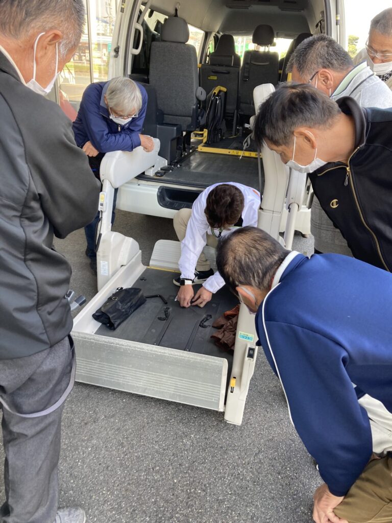 車いすの固定方法についても、運転手の方に普段通り実践していただきながら、より安全に固定するためのポイントを教わりました。