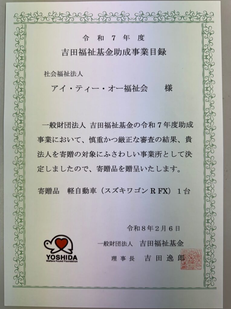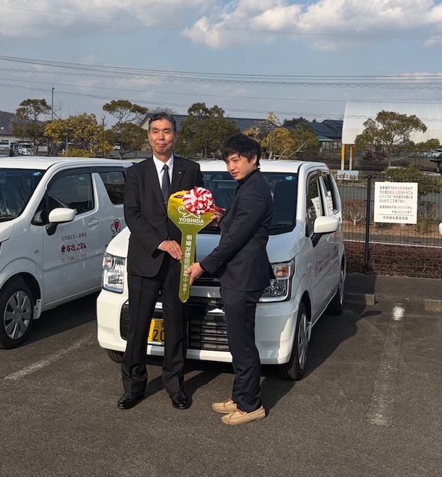 吉田福祉基金 目録贈呈式に出席しました法人本部です。先日、多気町にある吉田福祉基金の贈呈式に出席してまいりました。このたび当法人は、吉田福祉基金 理事長 吉田逸郎 様より軽自動車をご贈呈いただきました。昨今の物価高騰や厳しい運営環境が続く中、本基金によるご支援は大変心強く、利用者の送迎や訪問支援、業務連絡、地域活動などに大切に活用させていただきます。吉田逸郎様をはじめ、吉田福祉基金の皆さまの温かいご厚意に心より感謝申し上げます。今後も地域福祉の向上に貢献できるよう、職員一同努めてまいります。
